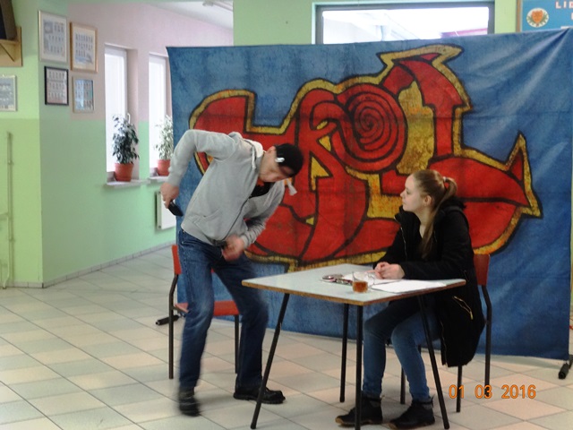 Dnia 01.03.2016 r. gościliśmy w szkole Teatr „Inspiracja” z Krakowa, który przedstawił spektakl profilaktyczny „Pętla zdarzeń”. W przedstawieniu poruszono problematykę agresji i przemocy rówieśniczej, przemocy fizycznej, ale także często występującej, a trudnej do wychwycenia przemocy psychicznej - równie dotkliwej i mogącej powodować tragiczne konsekwencje - począwszy od obelg, gróźb, szantażu i poniżania, po pozornie niewinne wyśmiewanie i plotki. W tej historii jej ofiarą stał się chłopak, którego zachowanie w żaden sposób nie wskazywało, że mógł tej przemocy doświadczać. Spektakl obejrzeli uczniowie z klas III – VI. Występujący aktorzy pokazali jak neutralizować przemoc na różne sposoby, między innymi przez rozwijanie poczucia empatii, które umożliwia wczucie się w sytuację ofiary. Idąc tropem nowoczesnej psychologii operującej pojęciem "trójkąta przemocy": napastnik-ofiara-świadek, wyeksponowali rolę i możliwości tego ostatniego. Przedstawili także jak kształtować umiejętności społeczne - rozwiązywać konflikty i opierać się naciskom ze strony otoczenia oraz wskazali, gdzie szukać pomocy i jakie mechanizmy obronne może przyjmować potencjalna ofiara.