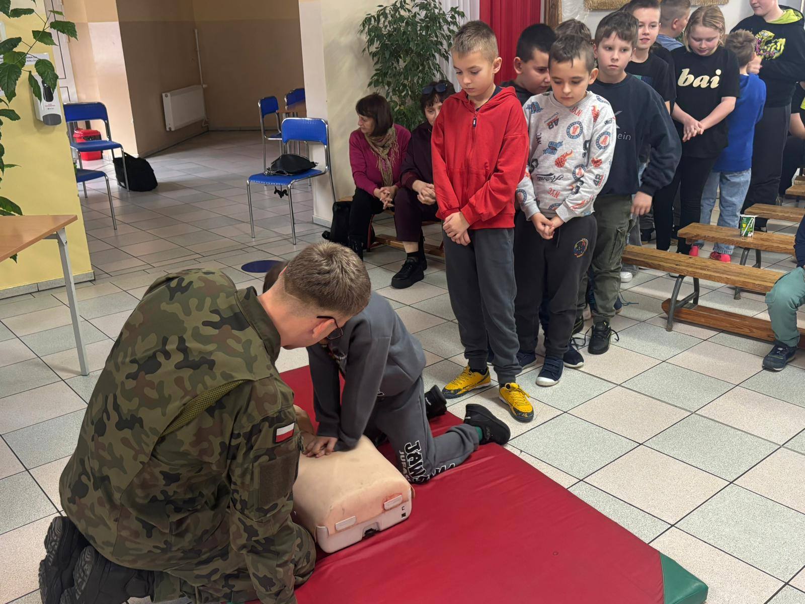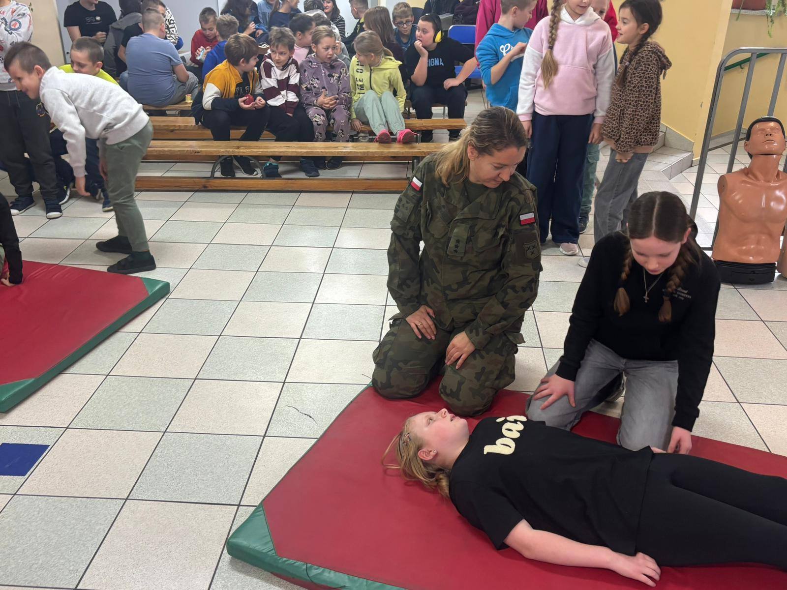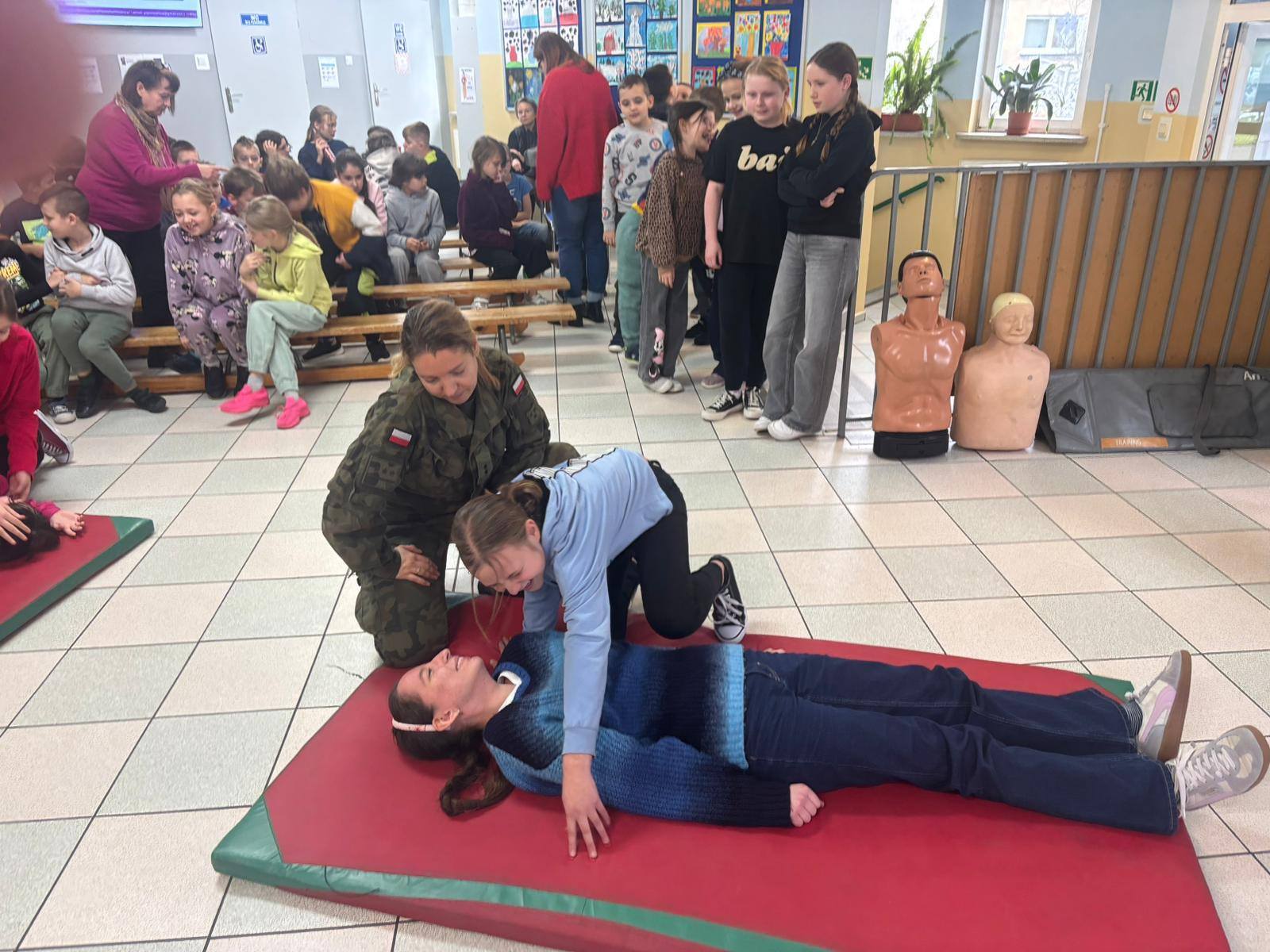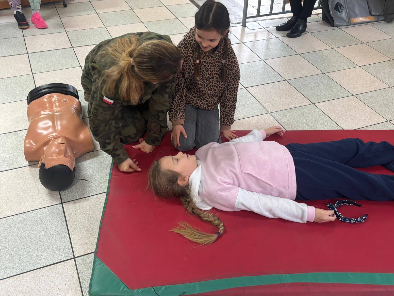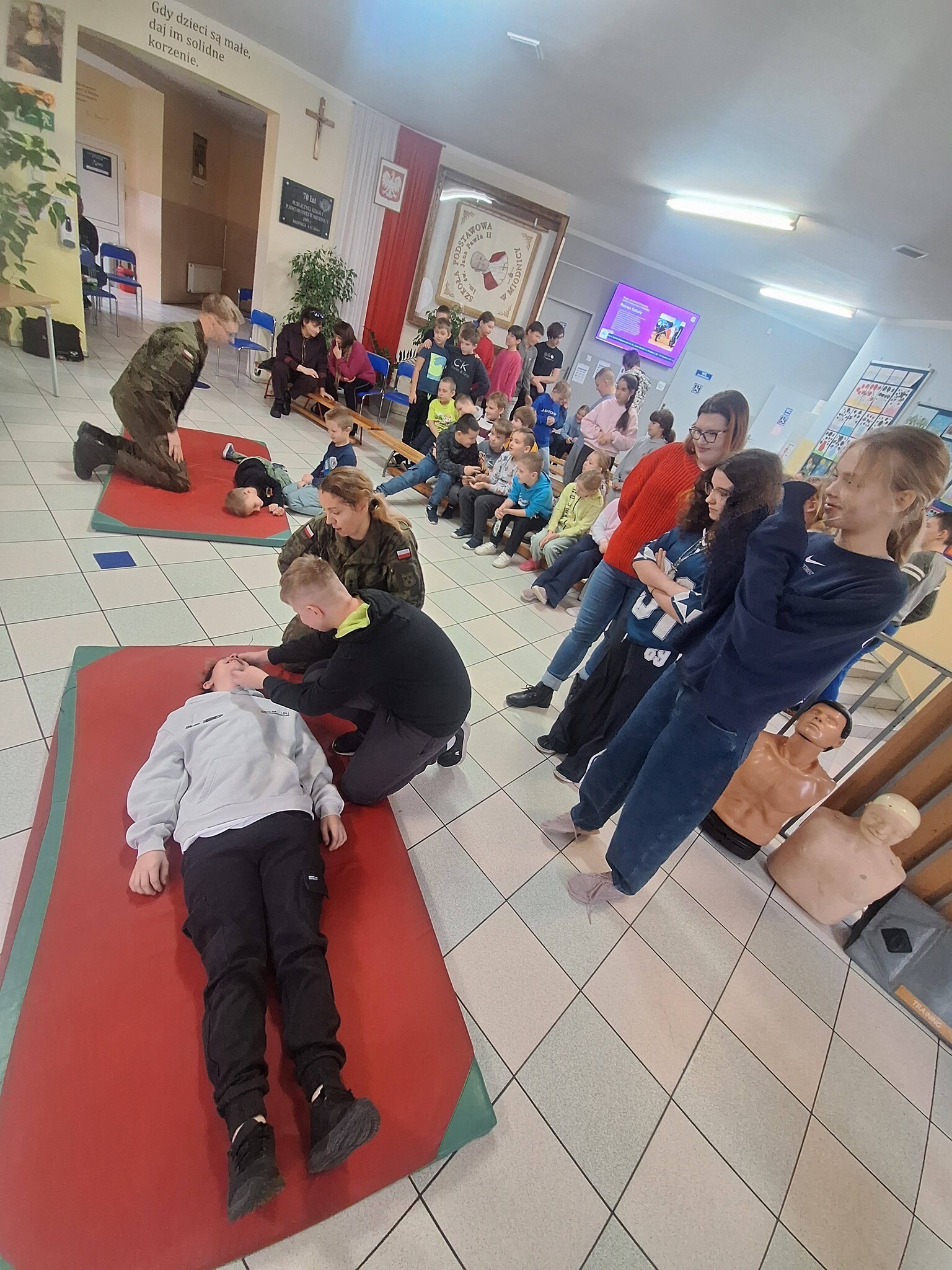 Dzieci z ogromnym zaangażowaniem ćwiczyły pierwszą pomoc i aktywnie uczestniczyły w rozmowach, dzięki czemu spotkanie było jednocześnie pouczające i bardzo dynamiczne