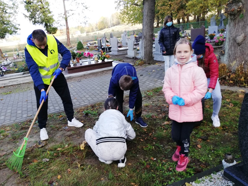 Uczniowie z klas IV – VIII wraz z rodzicami i nauczycielami chwycili za grabie, aby uprzątnąć cmentarz komunalny w Miodnicy. Grabili liście, porządkowali nagrobki, czyli wyrzucali wypalone znicze, zniszczone kwiaty i pielili rosnące w pobliżu chwasty. Uczniowie z dużym szacunkiem i zaangażowaniem podeszli do przydzielonych im zadań. Z wizytą na cmentarzu pojawili się też młodsi uczniowie, którzy wraz ze starszymi kolegami zapalili przyniesione znicze.