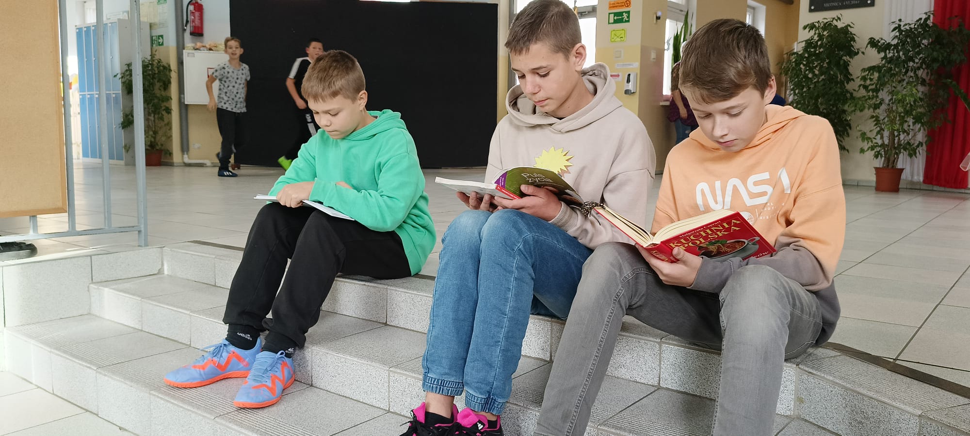 Czytaliśmy na krzesłach, ławkach, schodach i niemal gdzie popadnie uczestnicząc kolejny raz w biciu rekordu, w akcji PRZERWA NA CZYTANIE - IV MIĘDZYNARODOWA EDYCJA. Wydarzenie to odbywa się w ramach szerszych kampanii #MiędzynarodowyMiesiącBibliotekSzkolnych oraz Cała Polska czyta dzieciom. Doświadczenie swoistej biblioterapii pozwoliło nam uzmysłowić sobie, co mogą znaczyć słowa: "Kto czyta książki, żyje podwójnie" (U. Eco).