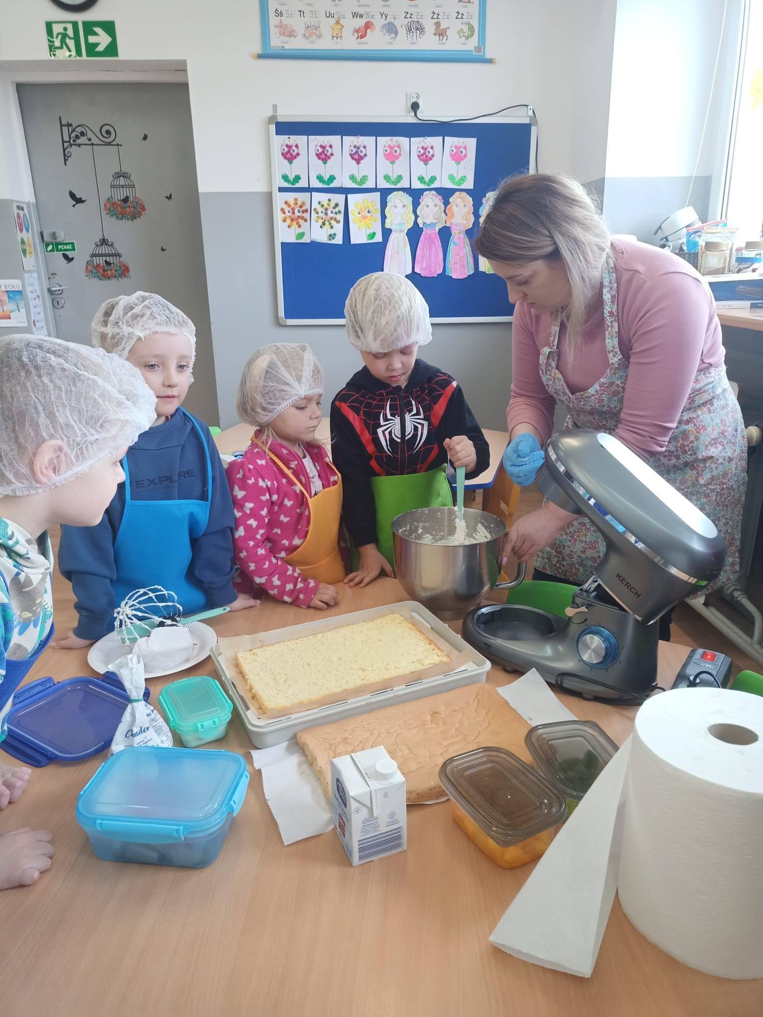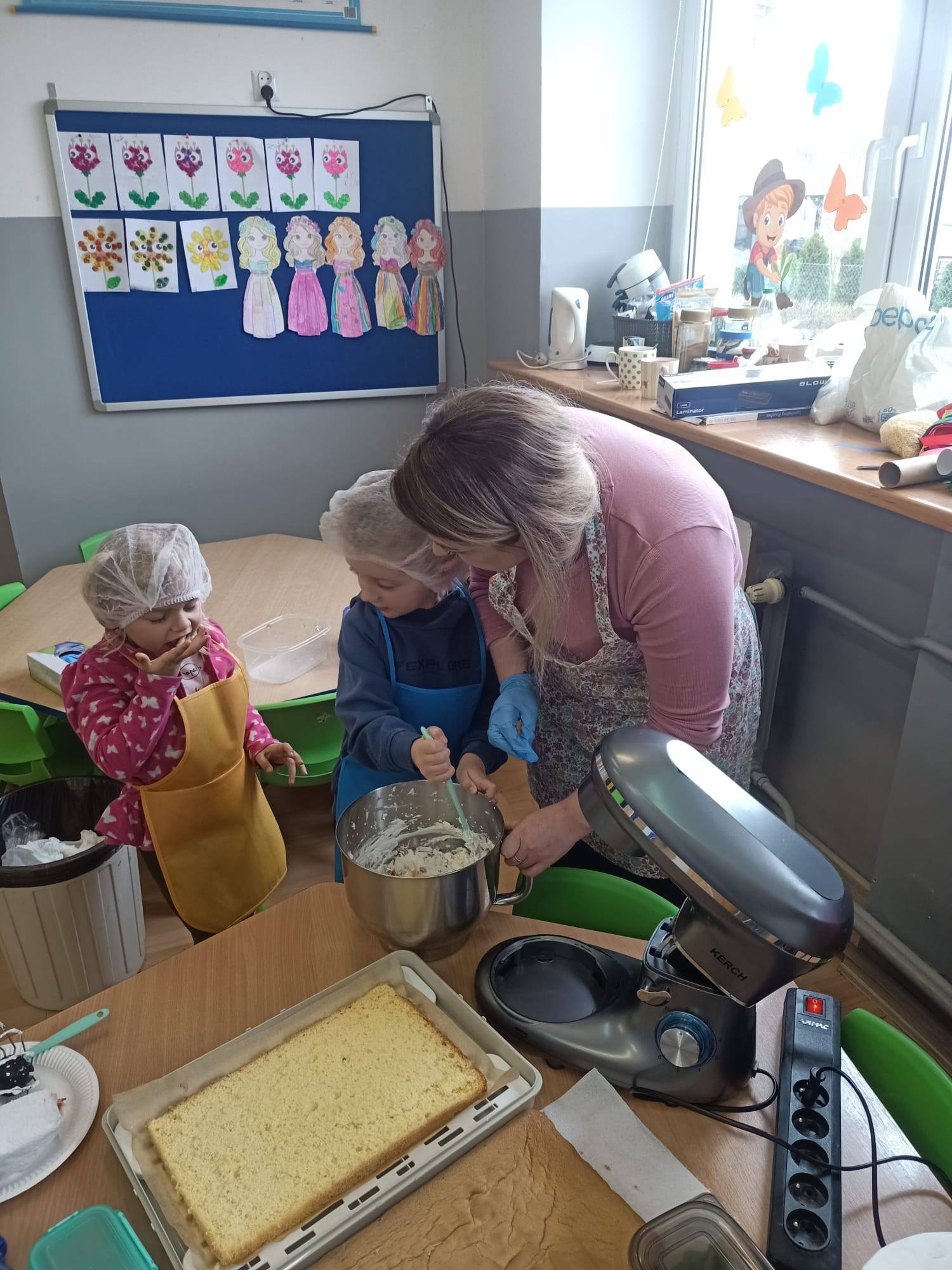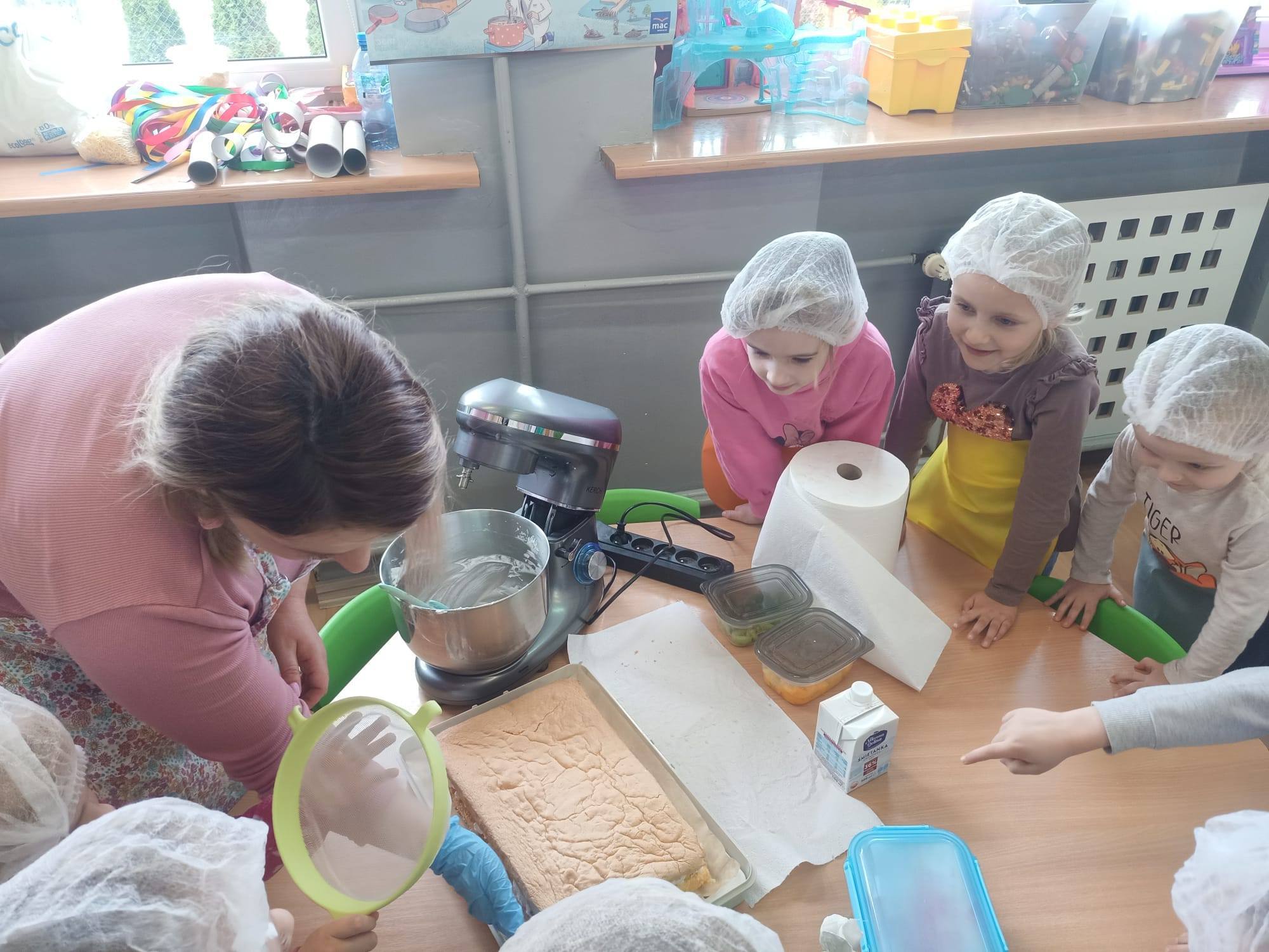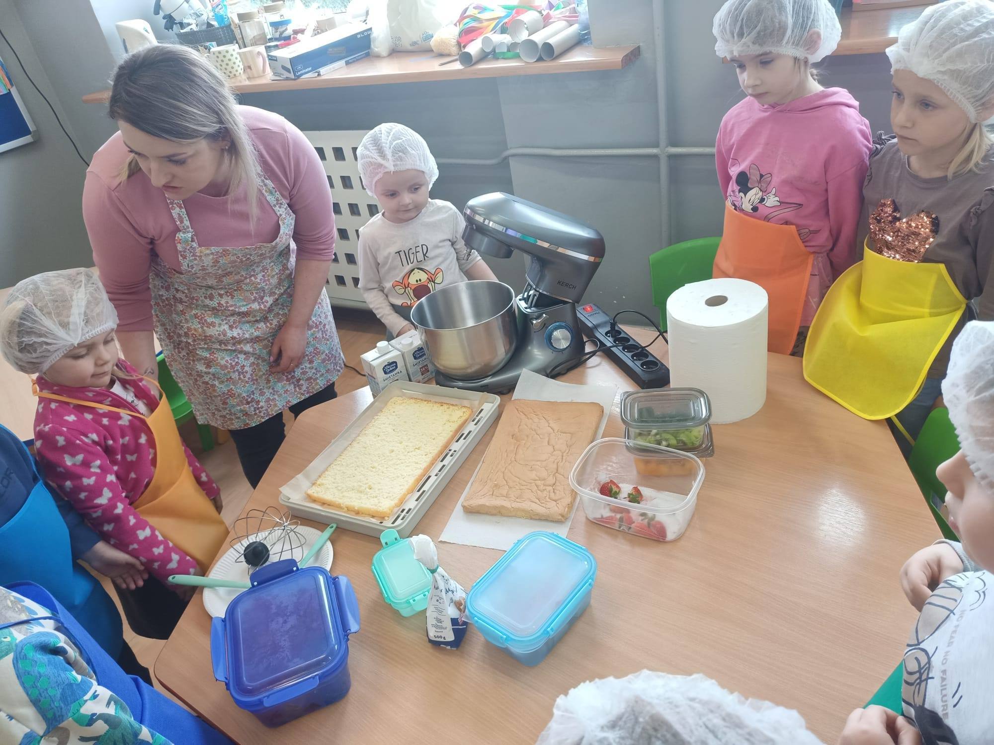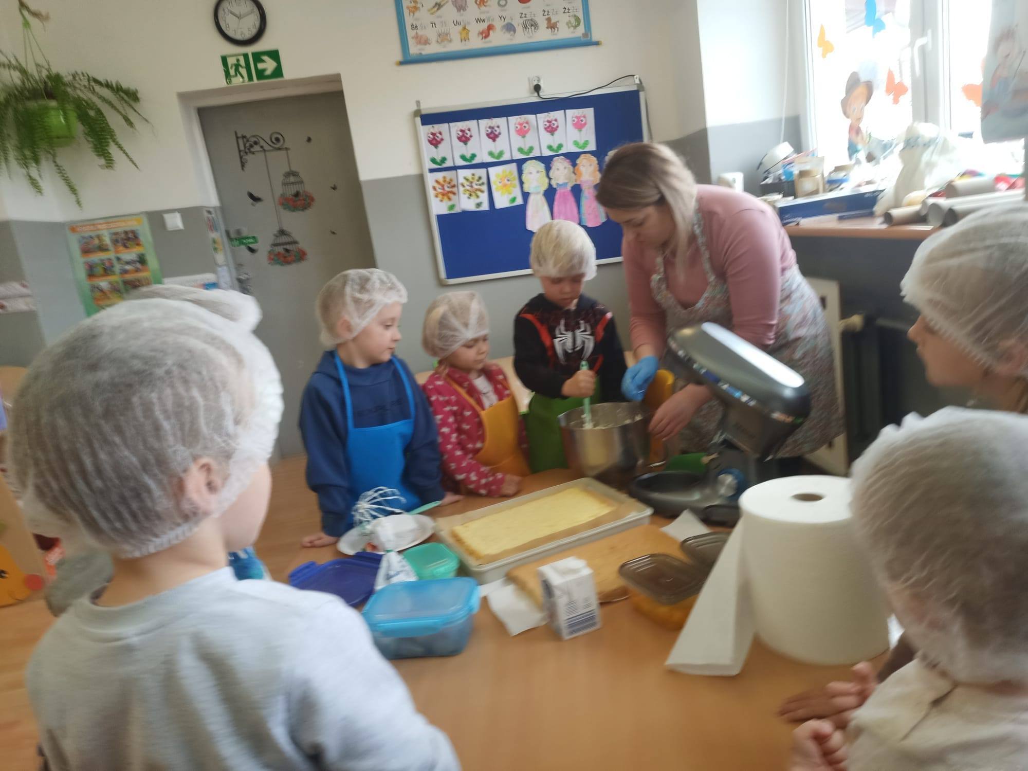 Warsztaty cukiernicze zostały przeprowadzone przez mamę jednego z przedszkolaków, która z pasją opowiedziała dzieciom o swojej miłości do pieczenia. Spotkanie było doskonałą okazją do integracji oraz poznania zawodu i zainteresowań rodziców