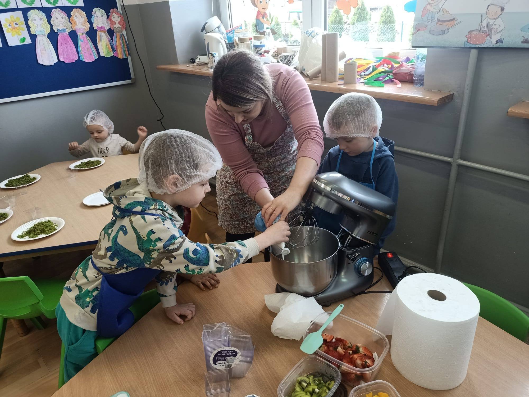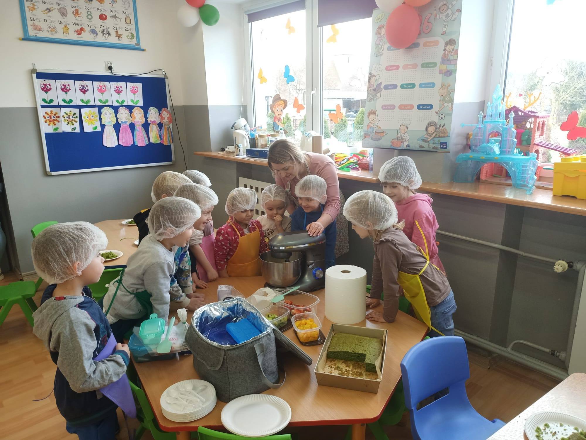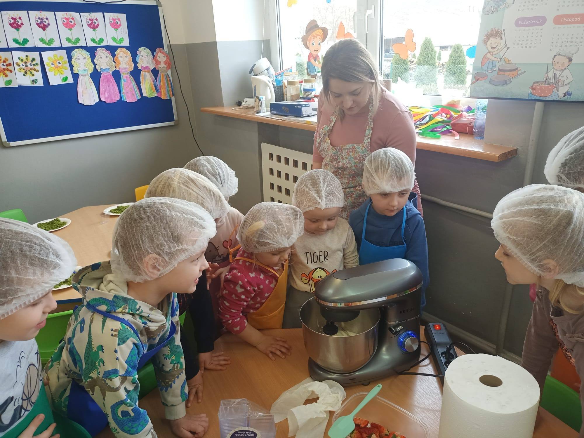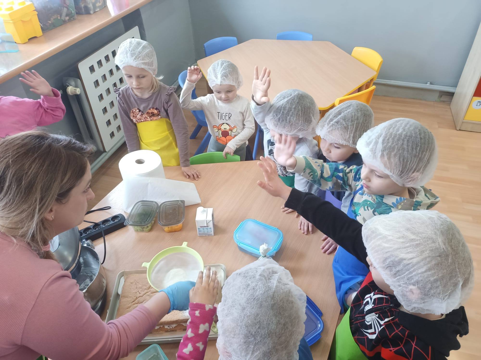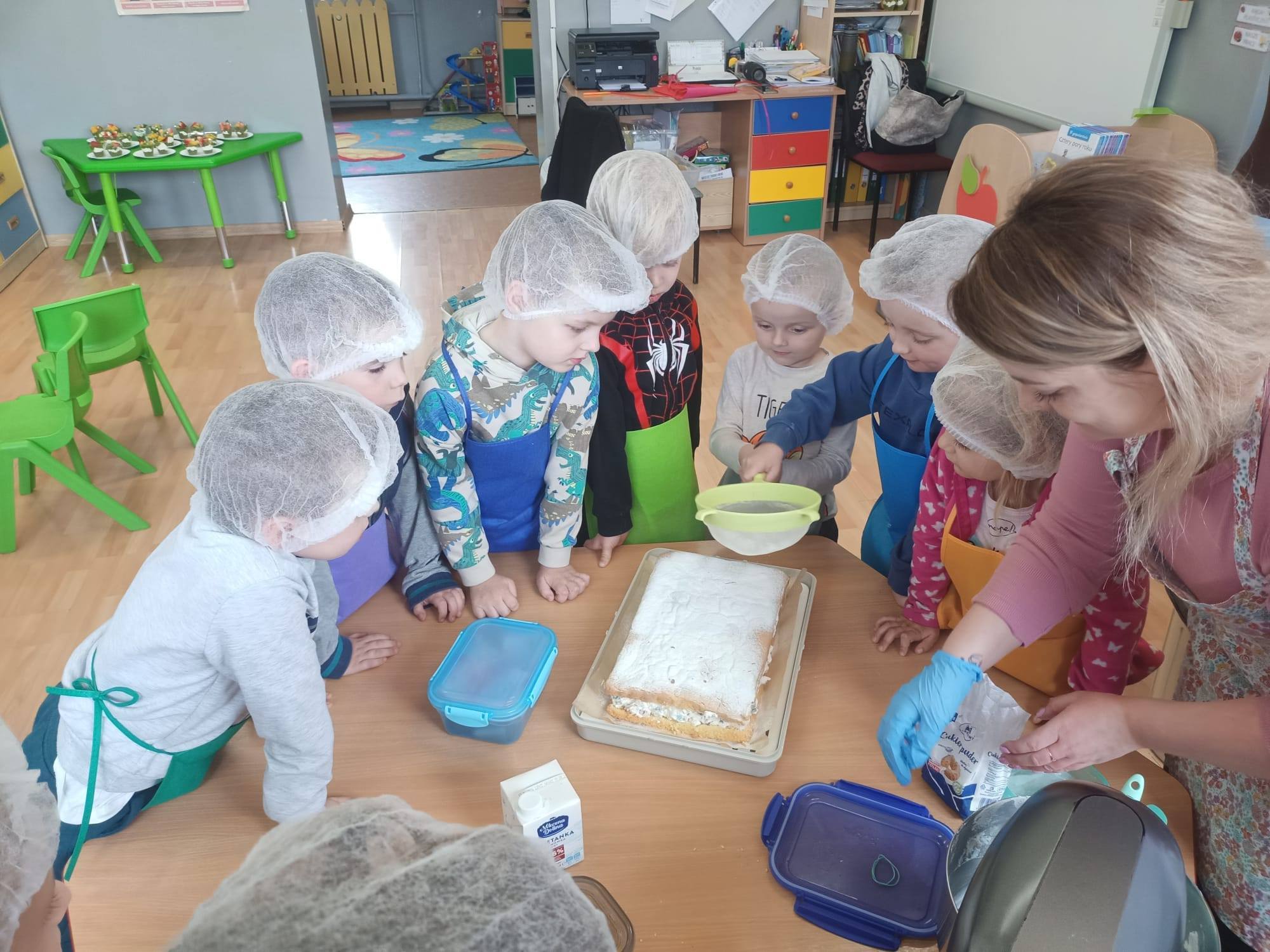 Warsztaty cukiernicze zostały przeprowadzone przez mamę jednego z przedszkolaków, która z pasją opowiedziała dzieciom o swojej miłości do pieczenia. Spotkanie było doskonałą okazją do integracji oraz poznania zawodu i zainteresowań rodziców