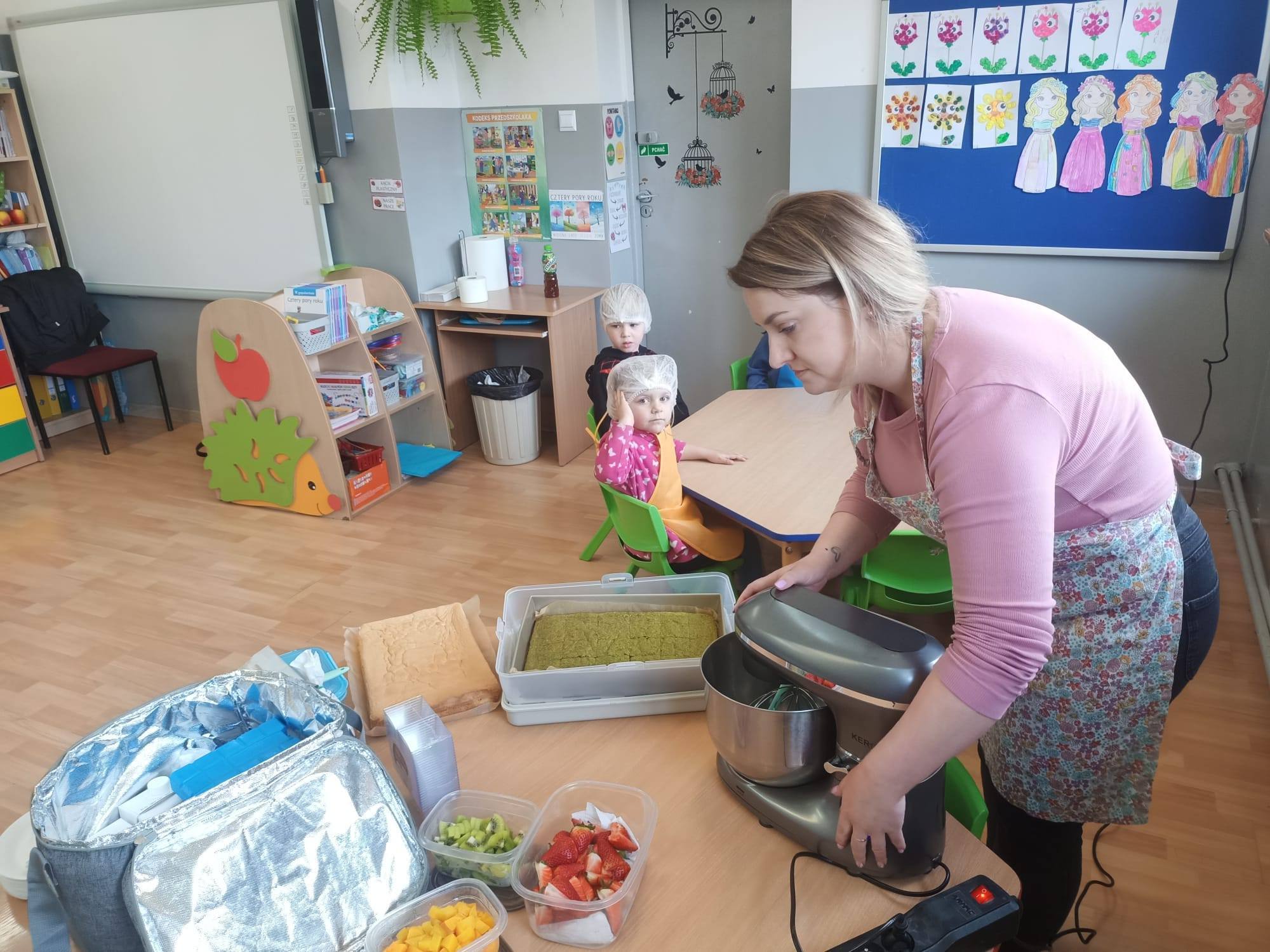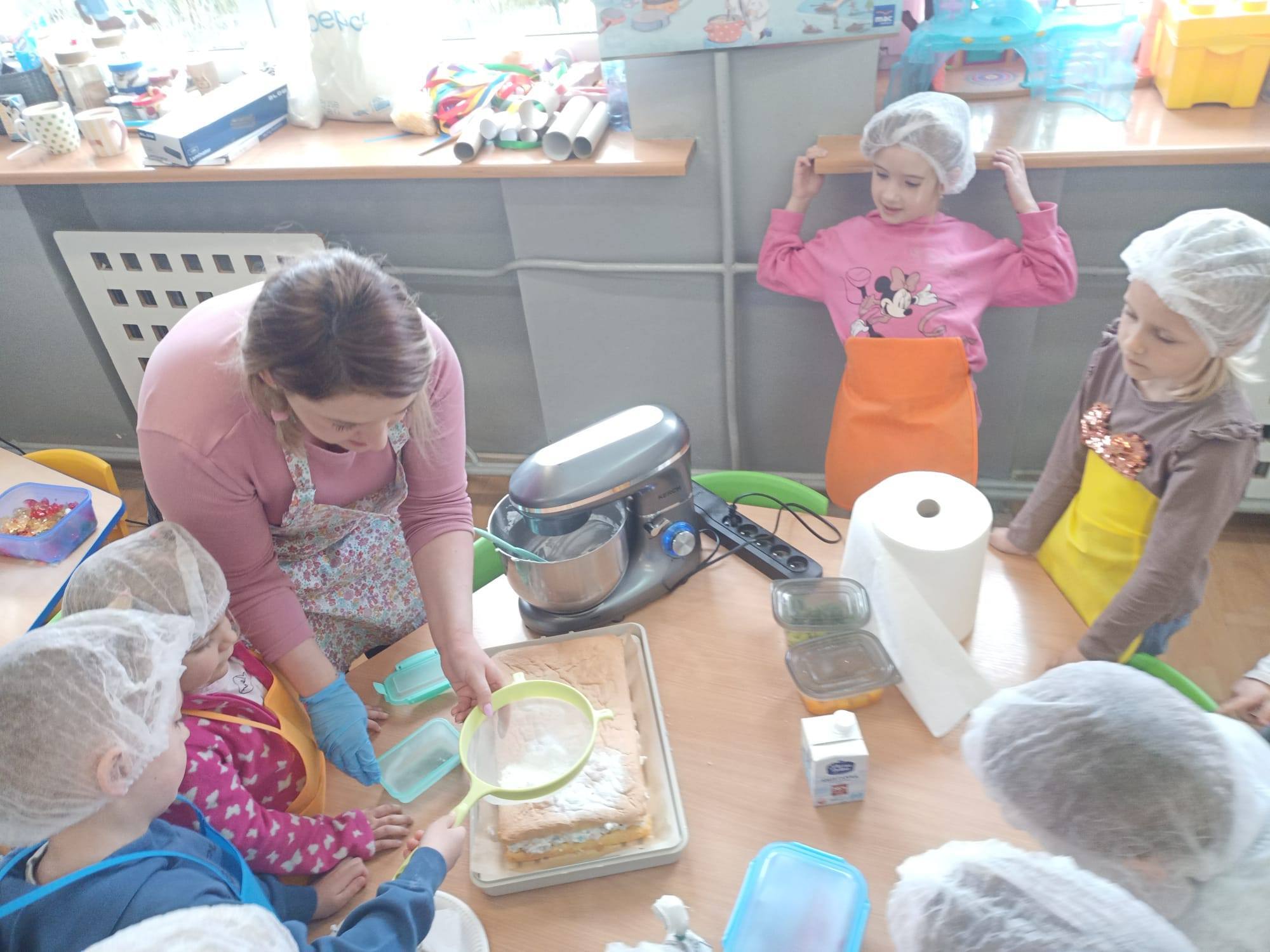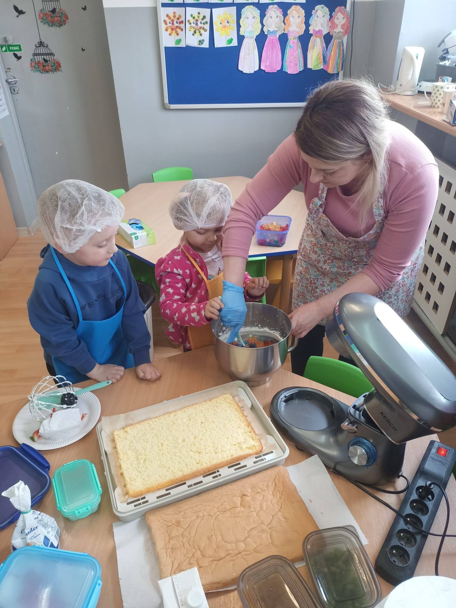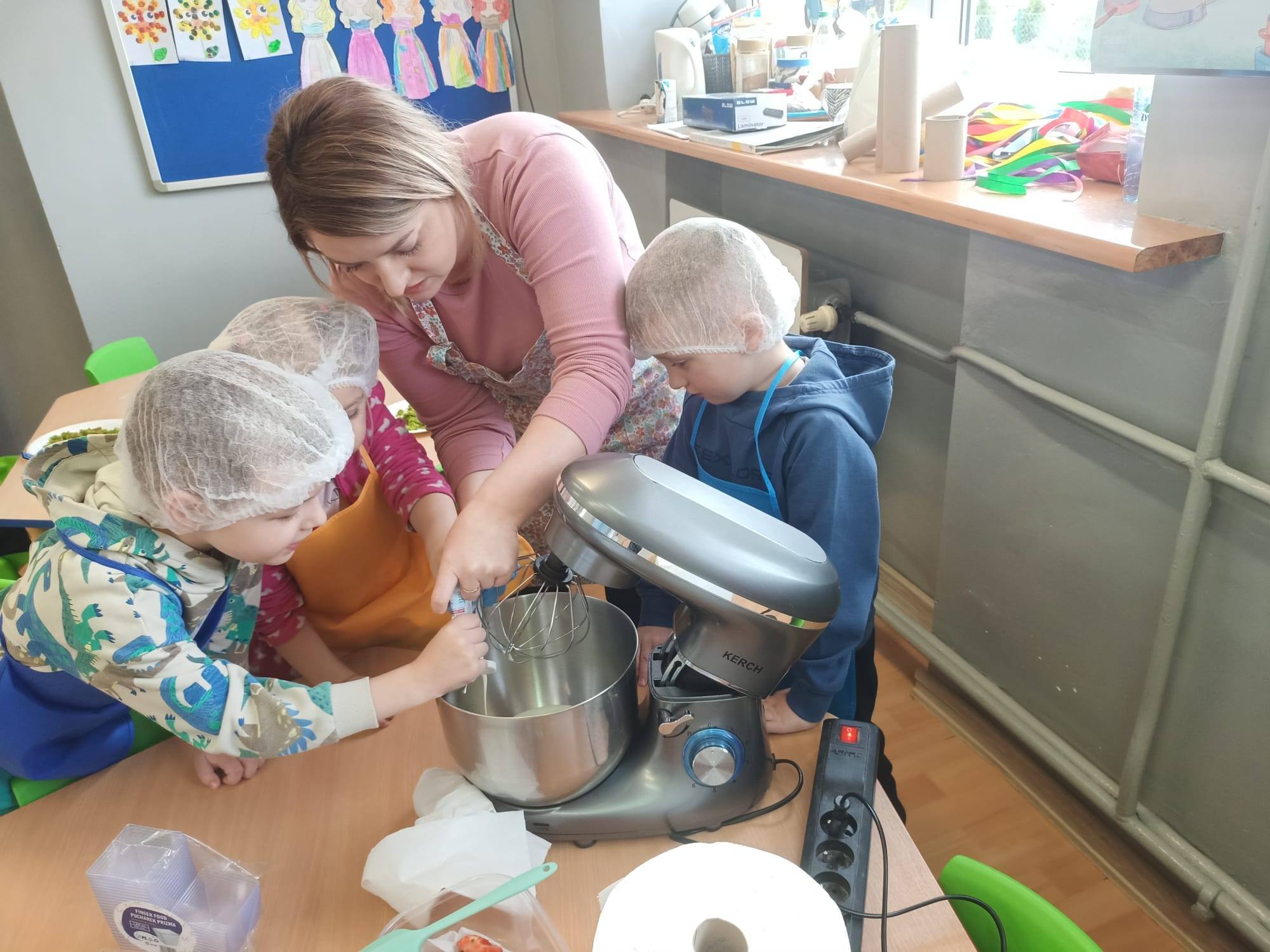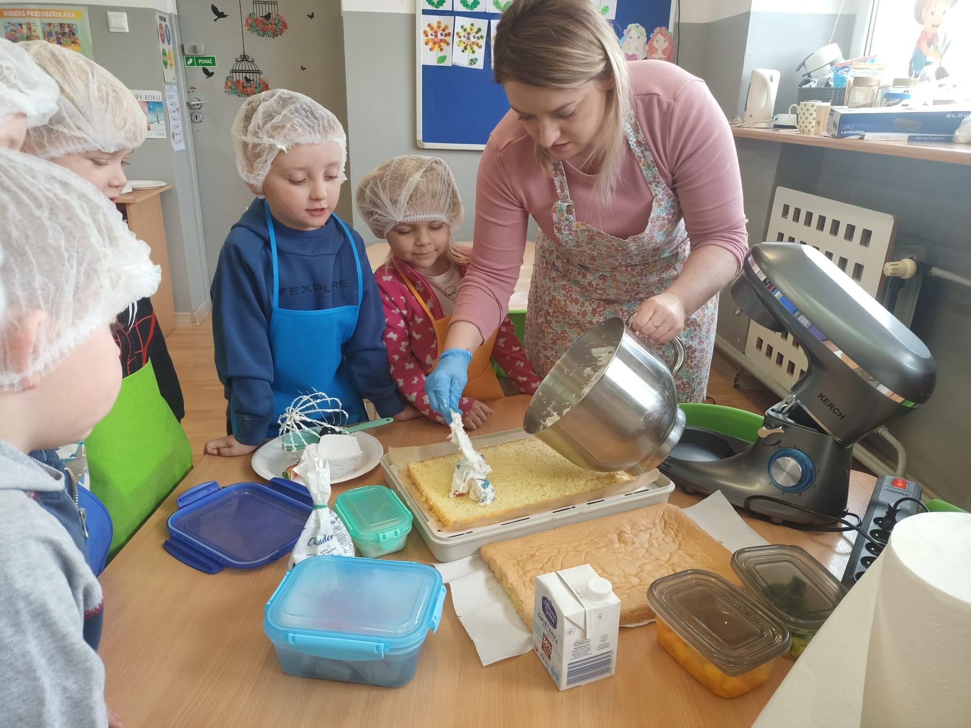 Warsztaty cukiernicze zostały przeprowadzone przez mamę jednego z przedszkolaków, która z pasją opowiedziała dzieciom o swojej miłości do pieczenia. Spotkanie było doskonałą okazją do integracji oraz poznania zawodu i zainteresowań rodziców