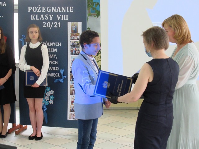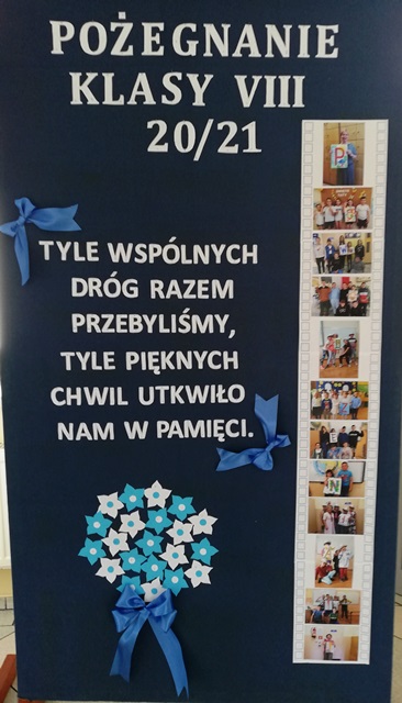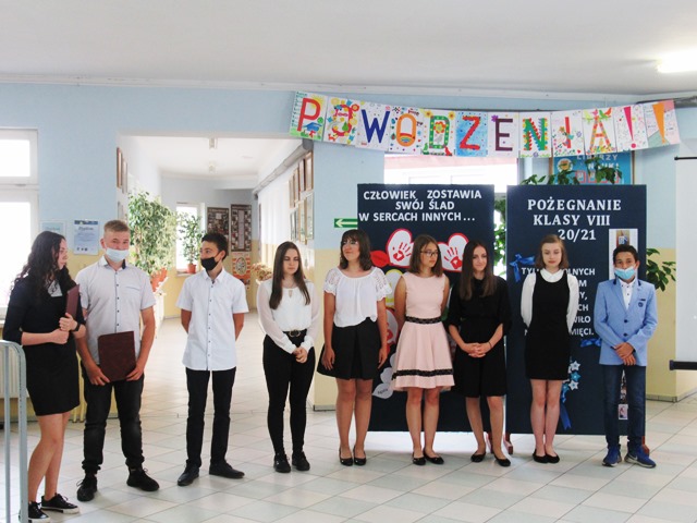 Dnia 23.06.2021 r. na uroczystym apelu pożegnaliśmy uczniów klasy VIII. W akademii wzięli udział uczniowie klasy VIII, rodzice oraz obecni i byli pracownicy szkoły. Po uroczystym ślubowaniu Pani Dyrektor Anna Kuczak wręczyła tegorocznym absolwentom Dyplomy Absolwenta PSP w Miodnicy, następnie wraz wychowawczynią Iwoną Michalską wyróżniła uczennice, które uzyskały najwyższe wyniki w nauce: Oliwię Chudoń i Zuzannę Kasprzyk, a ich rodzicom wręczyła listy gratulacyjne. Uhonorowani zostali też wszyscy nasi uczniowie klasy VIII: Agata Bartosińska, Oliwia Chudoń, Łukasz Duras, Maria Erdman, Bartosz Kacprzyk, Izabela Kasprzak, Zuzanna Kasprzyk, Szymon Majerski, Victoria Zielińska, którzy przez te wszystkie lata reprezentowali szkołę w wielu konkursach, akcjach, ustanowili rekordy szkoły w rzucie piłką lekarską i biegu na 1000 m, brali aktywny udział w pracy wolontariatu, Samorządu Uczniowskiego, gazetki szkolnej - otrzymali oni dyplomy, nagrody, puchary. Zostały także wręczone listy z podziękowaniami skierowane do rodziców, jako wyraz wdzięczności za wieloletnią pracę i zaangażowanie. Nasi uczniowie otrzymali też świadectwa ukończenia nauki religii w szkole podstawowej. Następnie Samorząd Uczniowski przygotował dla wszystkich mały prezent, a uczniowie klas II i VII pożegnalne filmiki. Ciepłe słowa, podziękowania i życzenia sukcesów skierowali do naszej młodzieży Pani Dyrektor Anna Kuczak, wychowawczyni Iwona Michalska, a także zaproszeni goście: Pani Zofia Zawadzka oraz Pani Edyta Gołąb, które przekazały na ręce uczniów drobne upominki. Na koniec klasa VIII przedstawiła wszystkim prezentację, która przypomniała lata spędzone w naszej szkole. Zaprezentowano też efekty pracy całej społeczności naszej szkoły, która na pożegnanie klasy VIII wykonała napis: „Powodzenia!!” w postaci wiszącego banneru oraz filmiku.